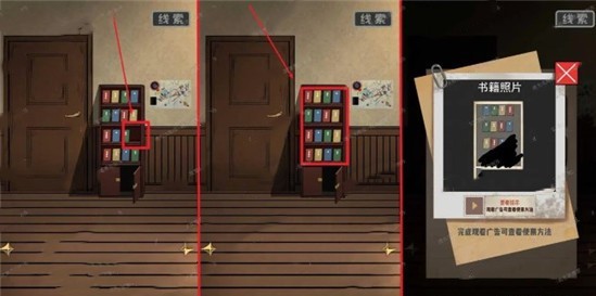 5、选择黄皮书点击书架上少了一本书的那个位置将黄皮书置入,接着点击书架进入小游戏。这个小游戏是这样,点击可以交换2个书本的位置(这里也很操蛋,点击之后看不出来点了没有),可以点击右上角的线索查看书籍的提示,我直接告诉各位如何摆放吧。先根据提示上摆放,右上角被黑色涂鸦盖住的地方其实就是左上角倒过来的样子,因此从上至下第四排最*右边是绿色,最