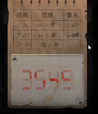 2、去办公楼拿零钱买车票,办公楼门已经被锁了,去警卫亭找王伯,王伯不在,密码在值班表上,跟报纸后面的透明卡片有关系,得到密码3549。