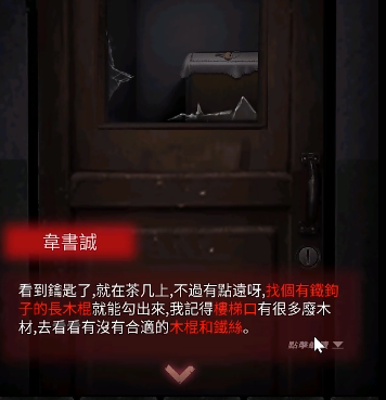 4、钥匙在茶几上,但是距离过远,用锤子把楼梯口木头撬开,获得木棍,走廊右边门上面获得铁丝,组合在一起,拿到钥匙。