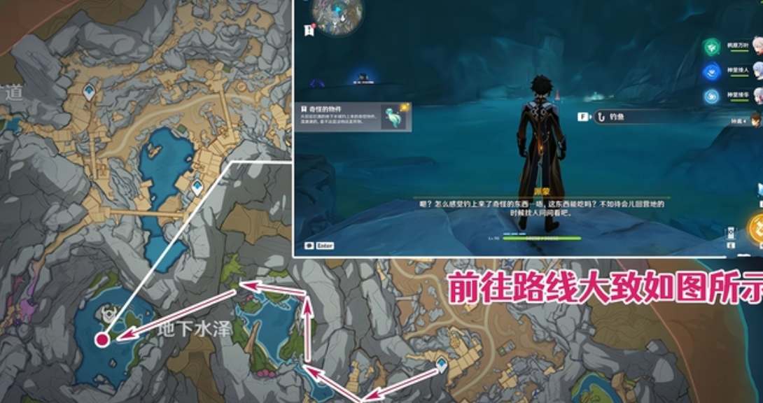 2、前往地下水泽钓鱼会钓到一个“奇怪的物品”,然后与海迪夫对话可以出发后续任务;