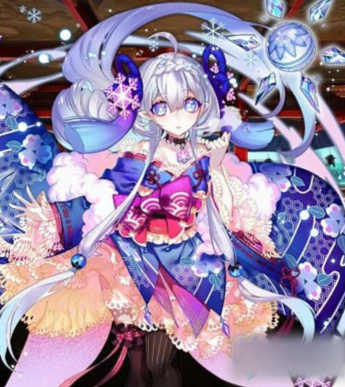 一血万杰雪女穿着蓝色的和服,扑闪着冰蓝色的大眼睛,冰雪在她身边绽开。