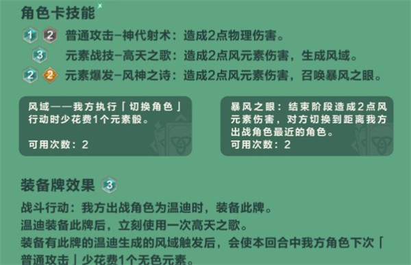 风属性角色一贯的设计风格,总会在角色切换上做文章。温迪的元素战技配合天赋卡,会使得速切体系在一回合中有更多的资源可以利用。加之其元素爆发具有定向拉卡入场的能力,经过合理规划后,在战斗中往往可以在做到将对手Key卡直接拉出秒杀。