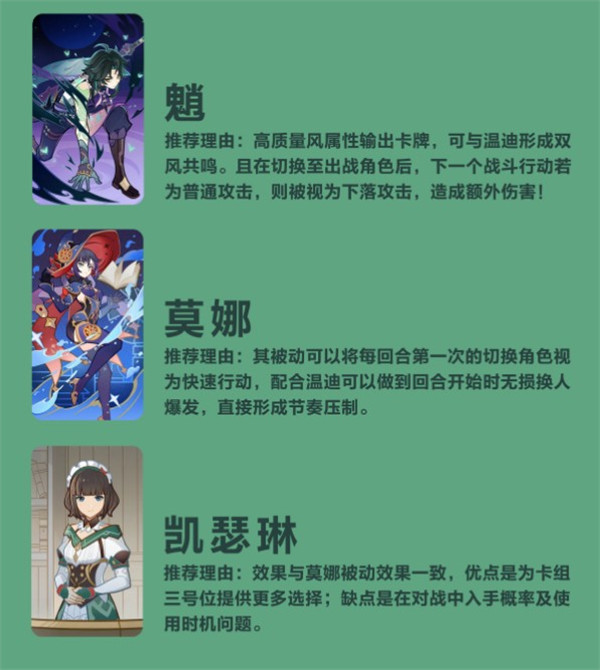 针对温迪减少切换角色费用的特点,推荐如下几张单卡最为搭配,旅行者可择优选择,将其纳入自己的卡组中。