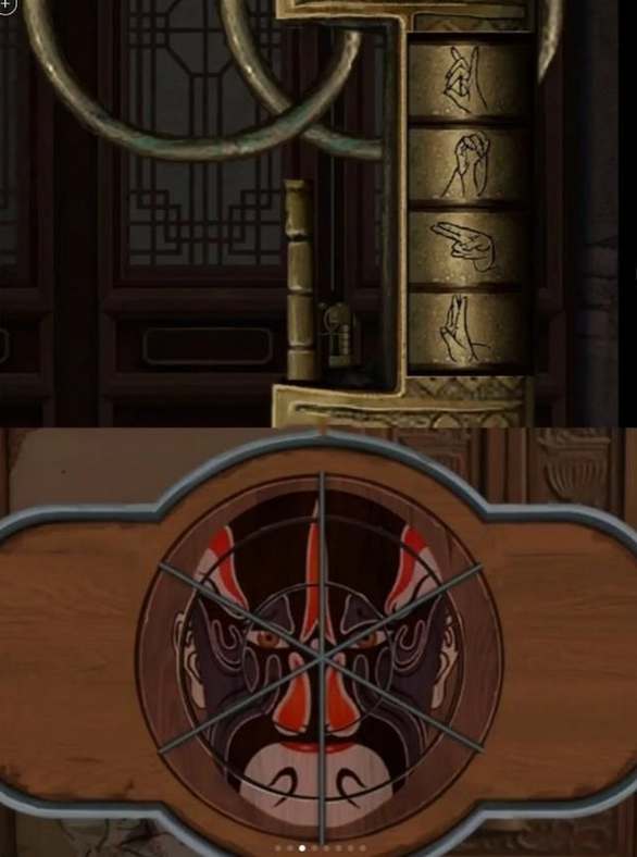 12、回到中间的房间点击衣柜,用钥匙开启右上方衣柜的锁可以获得【白脸谱挂件】,前往二楼房间在木匣处按照顺序摆放脸谱,开启匣子可以获得【铜剪】13、返回左侧房间点桌上的包袱,使用铜剪剪开包袱获得【镜面】,把镜面放在中间房间右侧书桌上,拿出头冠下的纸条可以查看线索。