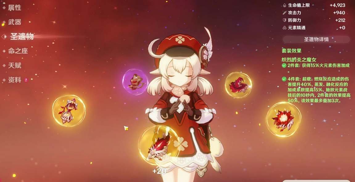 1、4魔女套:这个圣遗物适合用于打反应队,有火伤加成并且可莉E技能释放2次可以叠加2层套装效果,增益比较可观。