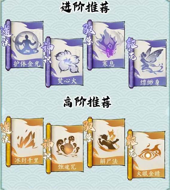 4、神通组合:护体金光、焚心火、寒息、缥缈身。高阶搭配冰封千里、蚀魂咒、解尸法、火眼金睛。