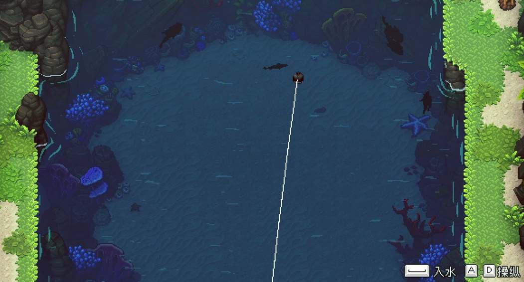 1、首先在河边抛下鱼钩等鱼咬钩,使用AD控制方向,让鱼线保持在蓝色光线的范围内慢慢往回拉就可以了;