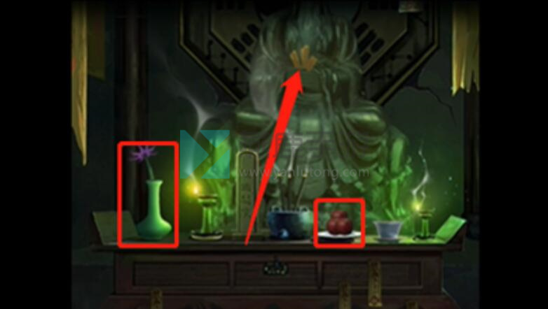 4、之后前往祠堂,将获得的花插到花瓶当中之后再将苹果放到右边的盘子当中。