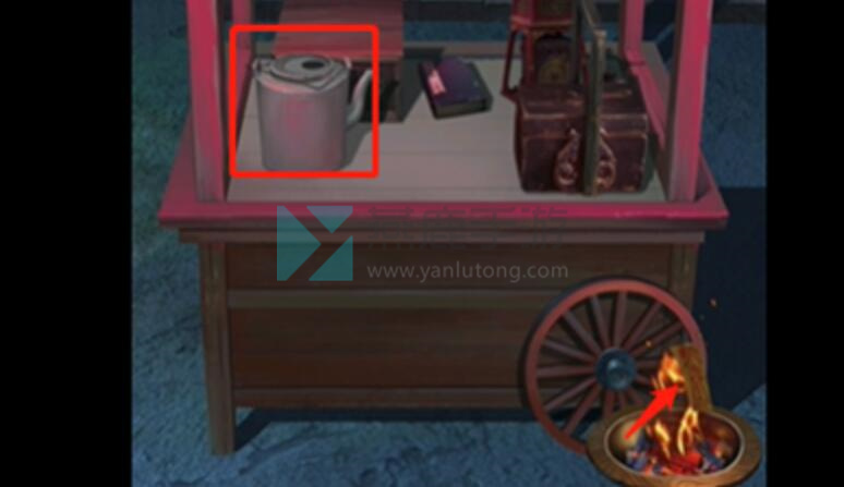 7、穿过树林之后前往镇上,在右边的摊位上将符咒放进火盆当中烧掉后可以获得茶壶。