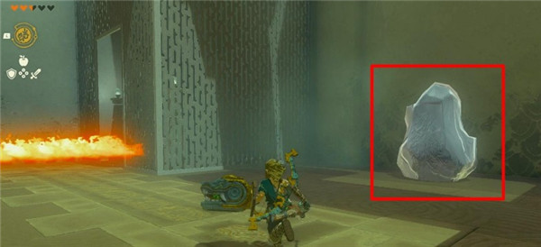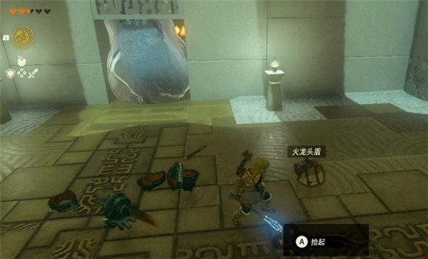 进入神庙后击败敌人捡到火龙头盾,带有火龙头的盾牌在防御时可以喷射火焰。随后使用火焰融化冰块继续前进。