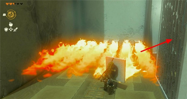 使用石板盾可以挡住火焰,随后向右继续前进。