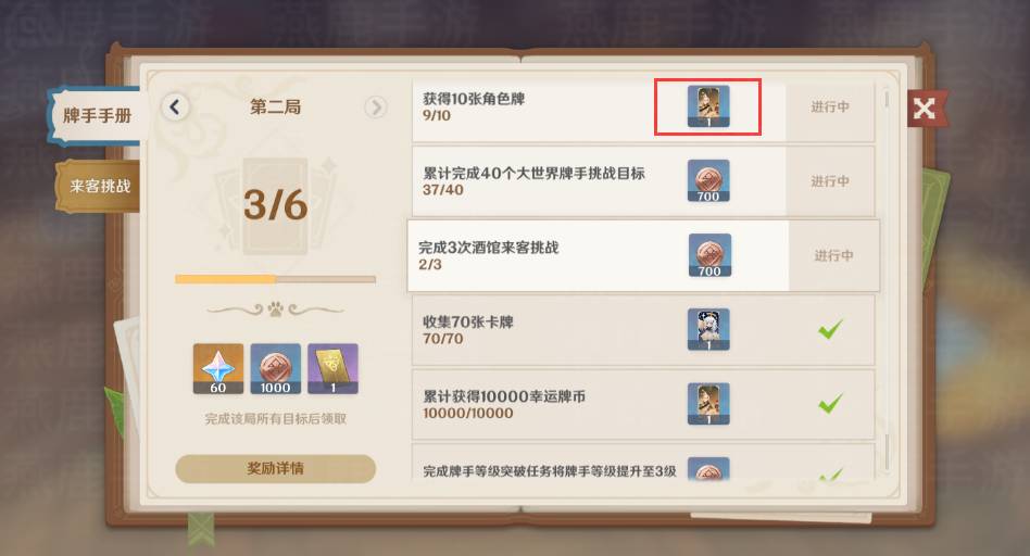 2、可以在牌手手册中看到第二局的任务,获得10张角色牌,就能够拿到[一掷乾坤]这张事件牌了。