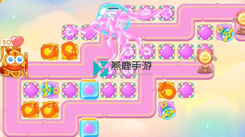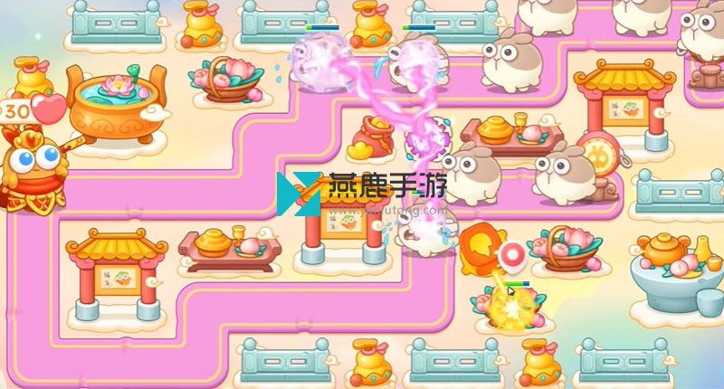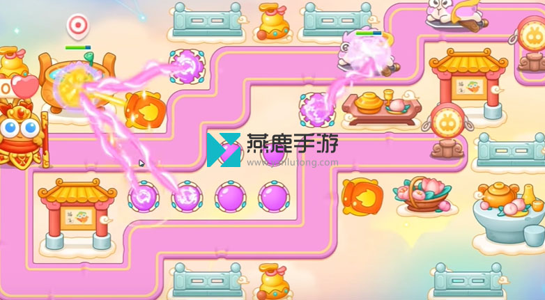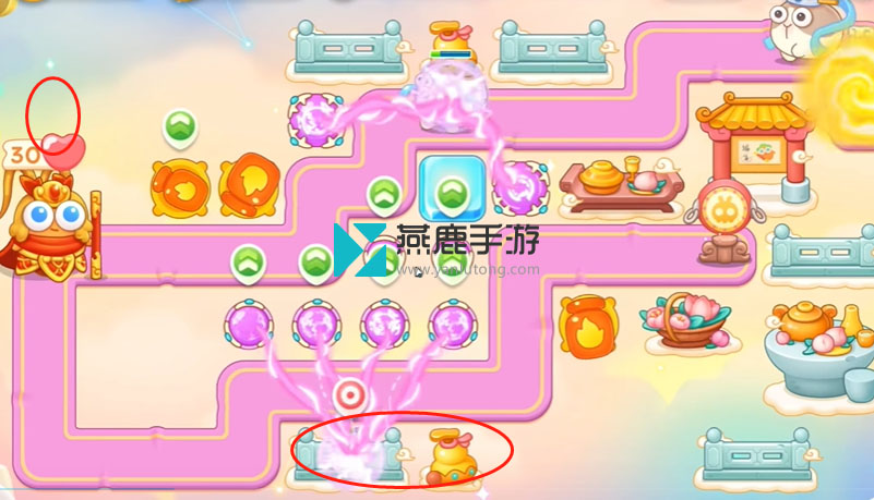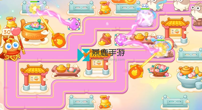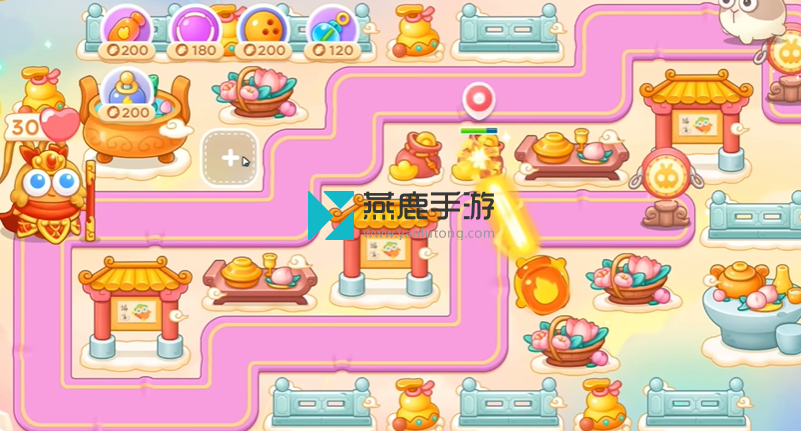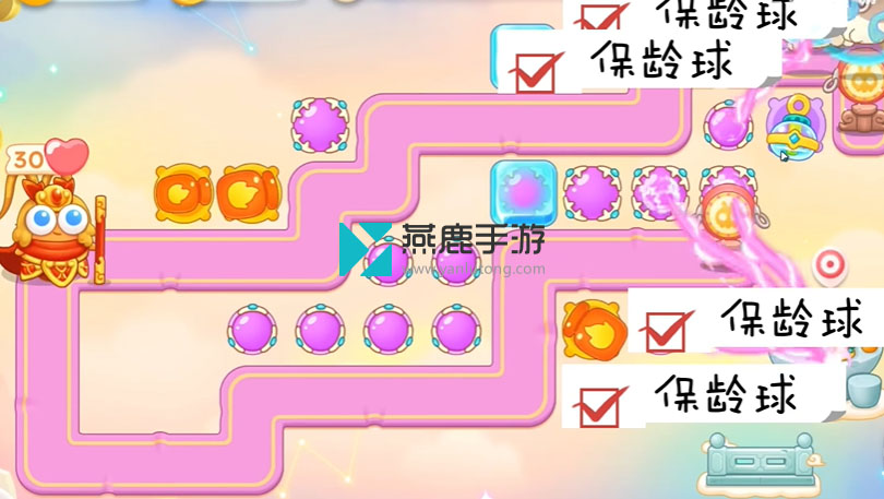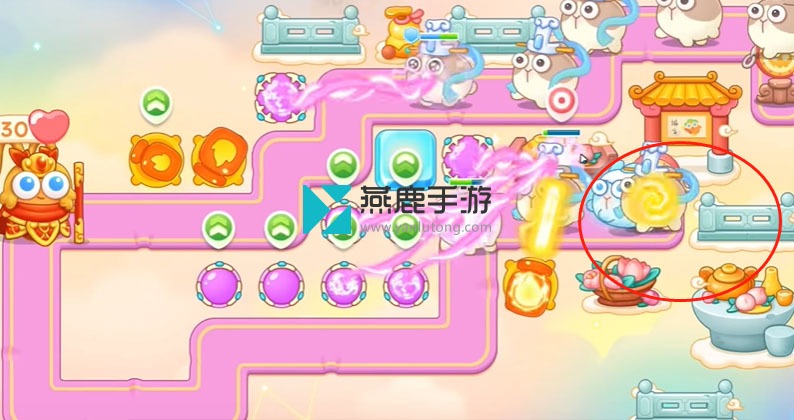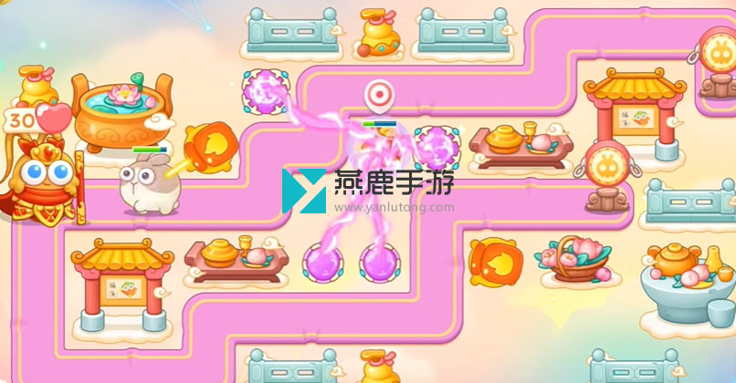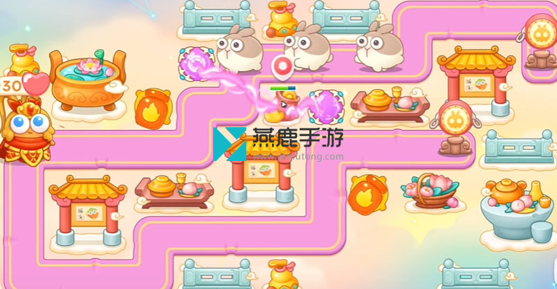2、左上建立一个火炮,打花篮,花篮打掉之后,空出位置打魔法球,之后继续打酒壶、围栏,打完瞄准钱袋,等最后一只兔子到钱袋上面,打萝卜门。