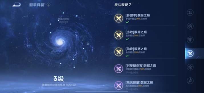 2、想要快速解锁生涯徽章需要多打排位、巅峰赛,并且在对局中尽量多拿到击杀、助攻提高自己的系统评分可以更快的提升熟练度。