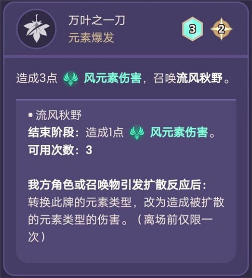 我方角色或召唤物引发扩散反应后:转换此牌的元素类型,改为造成被扩散的元素类型的伤害。(离场前仅限一次)
