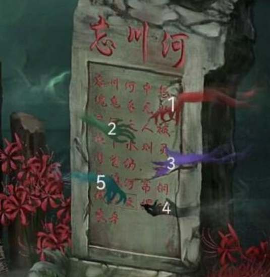 14、湖上出现四只鬼结合桌上信息得到孟婆汤顺序为蓝黄白绿蓝黄,得到孟婆汤。交给桥下鬼得到判官令放入,得到柳瑶。第二章的解密到此就结束了。