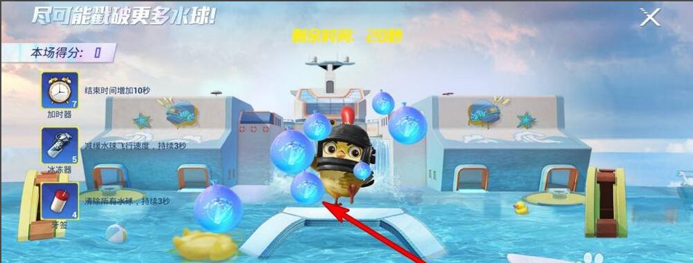 4、点击开始击球,丢出来的水球可以戳破,每破一个,增加1分,被水球砸中,则减一秒。