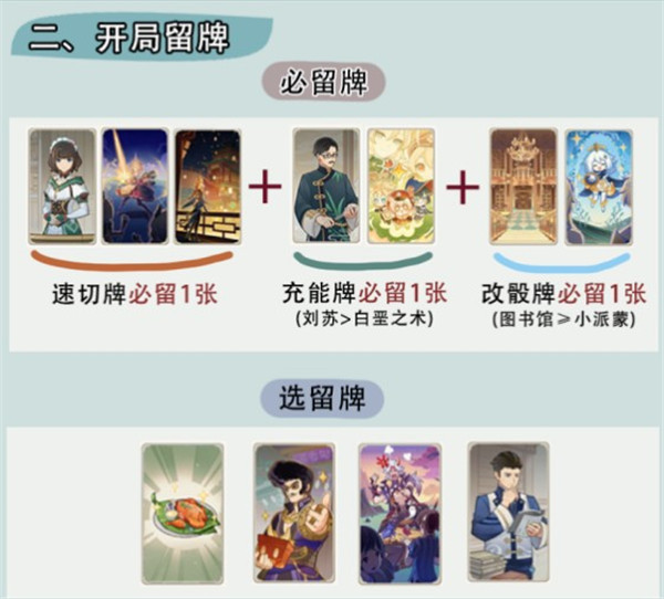 莫娜的召唤物为次抛,充能牌能让温迪召唤物续上水,也能让刻晴尽快开大收割。而作为三色队,为规避骰运不佳的情况,改骰或存骰的卡牌也是必须的。