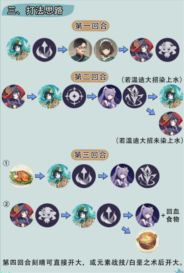 速切牌增加己方机动性;唐杜尔烤鸡可以在第三回合使用,增加元素战技伤害;仙跳墙可用于打爆发。