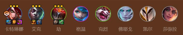阵容推荐:卡特,艾克,劫,格温,克烈,佛耶戈,凯尔,莎米拉