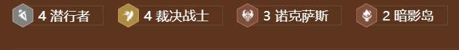 羁绊:4潜行,4裁决,3诺克萨斯,2暗影岛