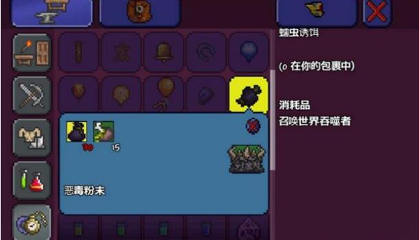 4、在腐化之地找到蘑菇在炼金台炼制30个恶毒粉末,然后将15块腐肉与恶魔粉末在恶魔祭坛合成蠕虫诱饵,接着就可以在腐蚀之地召唤世界吞噬者了。