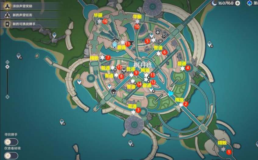 1、枫丹廷宝箱的位置与品质如下图所示,有多达15个宝箱等待玩家寻找。