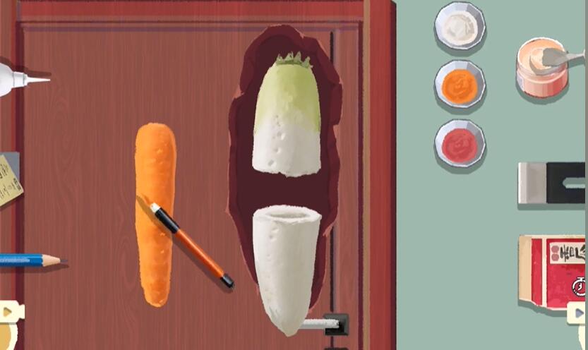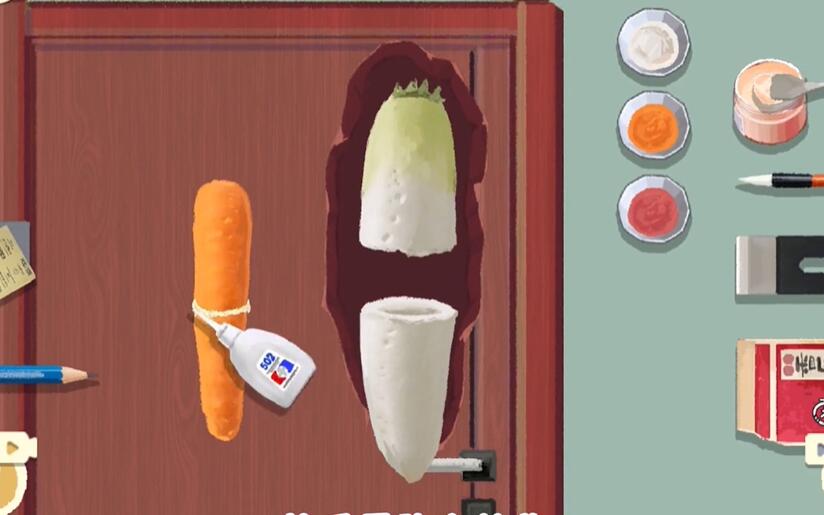 3、然后我们把胡萝卜放进白萝卜中,再使用胶水、磨砂布以及白色颜料进行伪装。