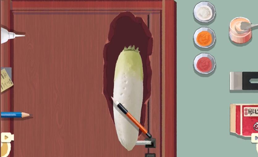 4、最后我们将萝卜放进坑中,用瓜子放入缝隙,涂上胶水红色颜料即可蒙混过关了。