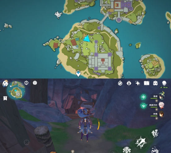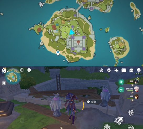 ④传送到别的地方,过一会回到原地,在盘泉都进会看到朱丽叶和一群夜鸦,去和她交谈知道罗密鸦被丘丘人带走了。