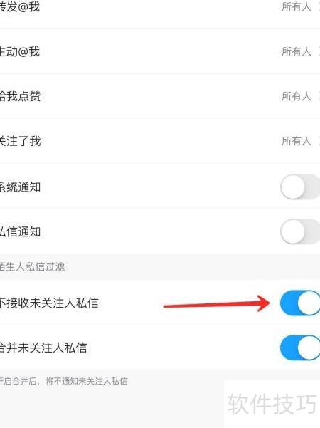 - 只需将不接收未关注人私信右侧的开关向右滑动即可完成设置。