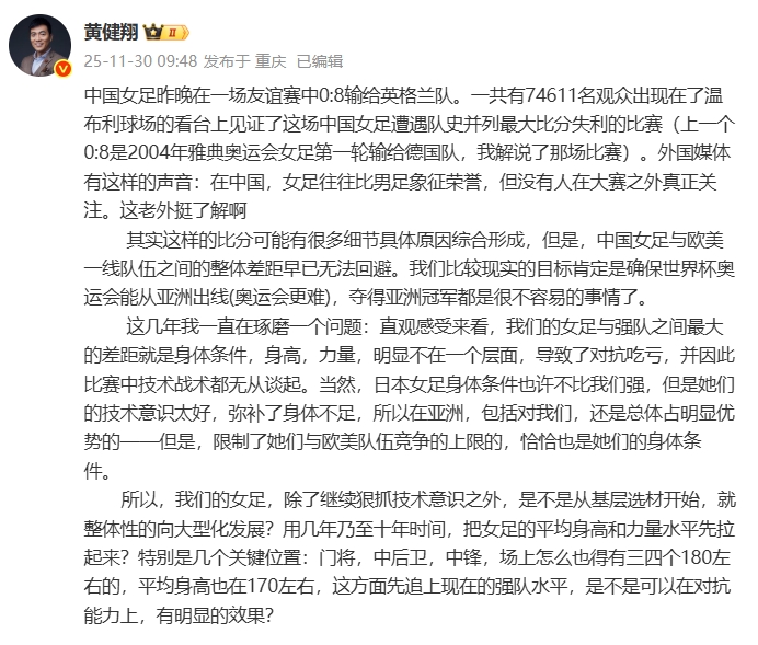 直播吧11月30日讯 中国女足友谊赛0-8惨败英格兰女足,黄健翔发文谈到了中国女足。