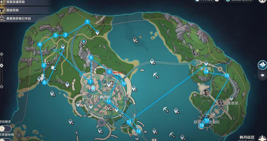 1、枫丹廷的水神瞳分布位置如下图所示,大家可以按照序号的位置前往游戏中进行收集;