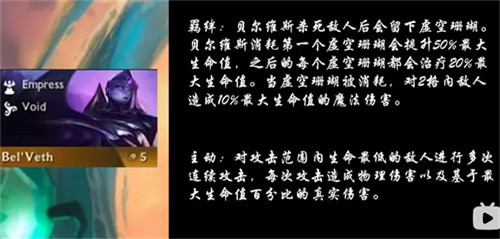 羁绊:贝尔维斯杀死敌人后会留下虚空珊瑚。贝尔维斯消耗第一个虚空珊瑚会提升50%最大生命值,之后的每个虚空珊瑚都会治疗20%最大生命值。当虚空珊瑚被消耗,对2格内敌人造成10%最大生命值的魔法伤害。