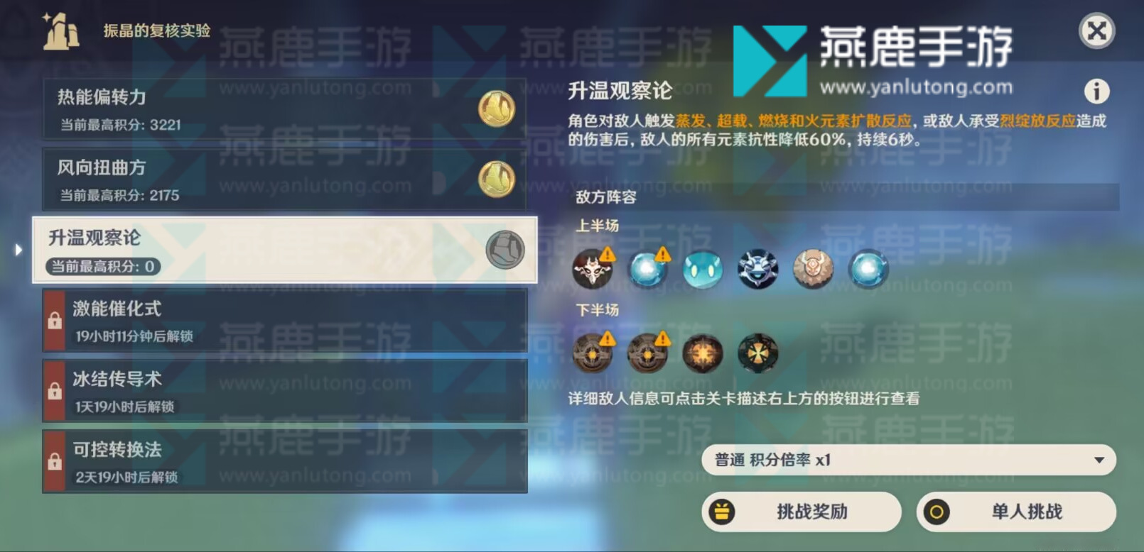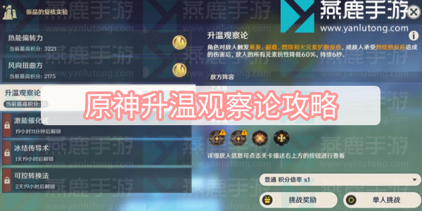 在原神的3.5版本里,有不少新版本活动。已经开放的[振晶的复核实验]活动中,是能够去使用试用角色来进行闯关。其中第三关是[升温观察论]。今天小编为各位玩家带来了原神升温观察论攻略,有需要这个攻略的玩家快来看看吧。