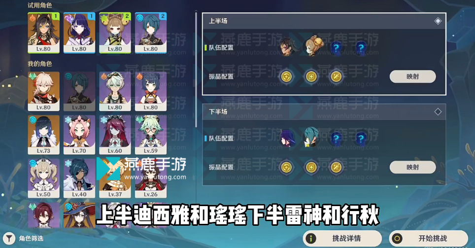 2、上半-[迪希雅、瑶瑶],下半-[雷神、行秋]。