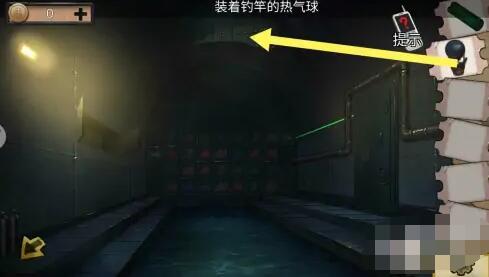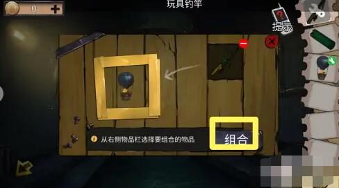 4、我们开始组合简易喷火器、篮子和布得到热气球。组合热气球和鱼竿即可获得装着鱼竿的热气球,将其从上方口子送上去给女主。