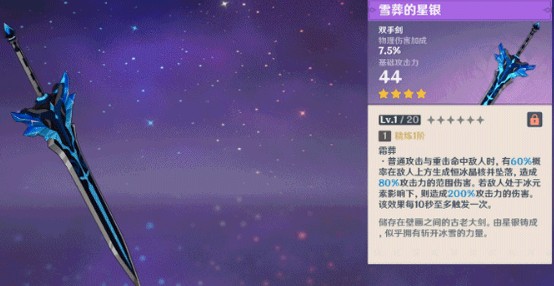 普通攻击与重击命中敌人时,有60%概率在敌人上方生成恒冰晶核并坠落,造成80%攻击力的范困伤害。若敌人处于冰元素影响下,则造成200%攻击力的伤害,该效果每10秒至多触发一次。