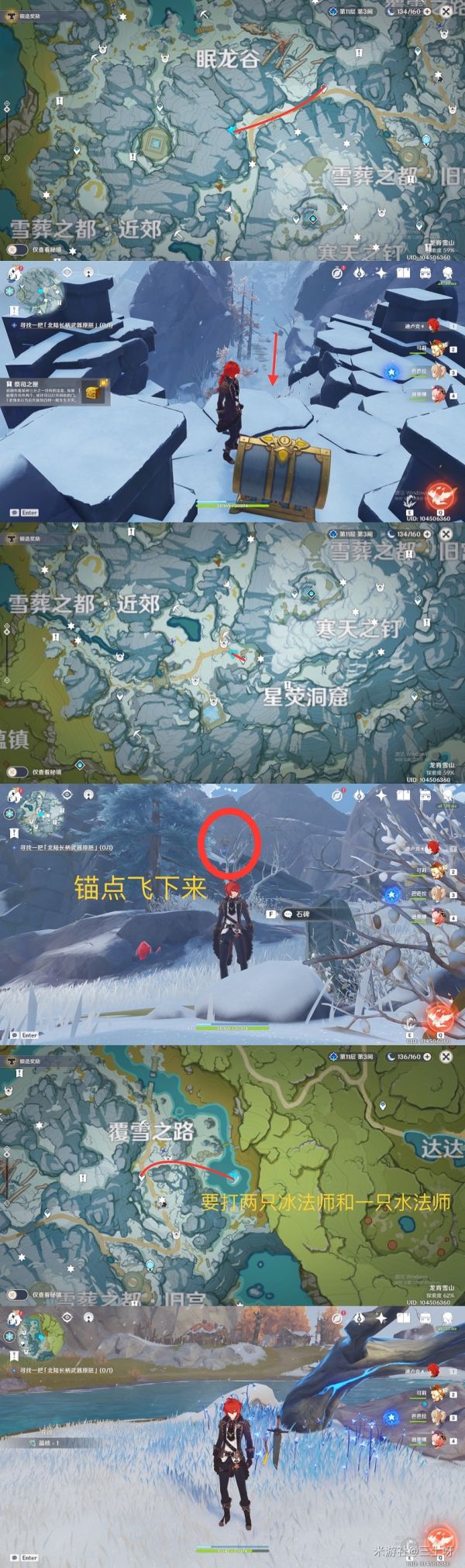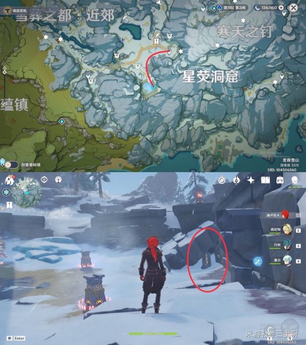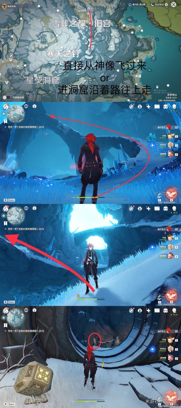 第六个石碑、来到藏雪之都下方的传送点,向后走,抬头向上看,上方平台处就是我们的目标