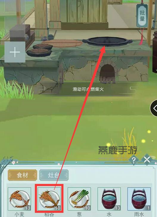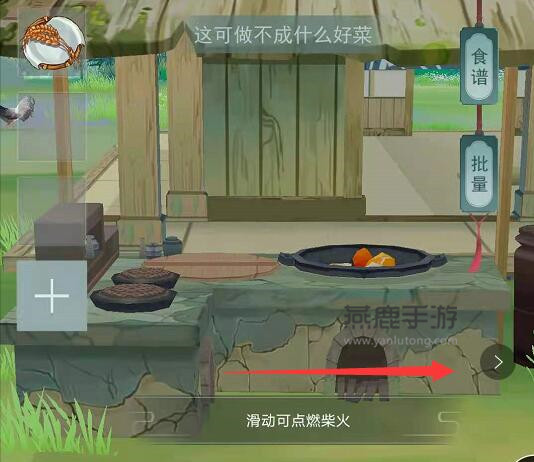 3、材料放好之后,向右滑动即可点燃柴火烹饪。