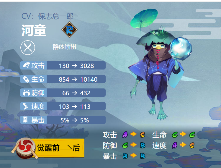 阴阳师的河童是一个群体输出的R式神,可以用流水化为利器攻击敌人。