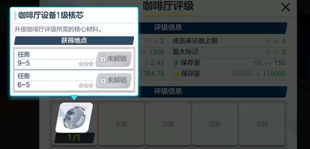 3、咖啡厅还会定期产出体力,同时升级还需要用到材料【设备核芯】,玩家可以通过主线关卡来获取材料。