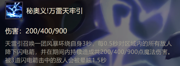 3、技能效果:天雷引召唤雷暴环绕自身3秒,1星时、2星时、3星时以0.5秒的当前区域敌人分别造成200伤害、400伤害、900伤害。被3道雷电击中的敌人会眩晕1.5秒。(如下图所示)