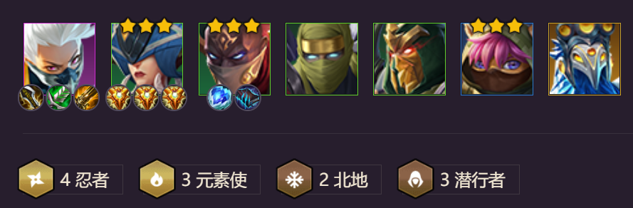 2、阵容分析:3元素召唤魔像,魔像与御界守天雷引作为前排,2北地普攻具有20%的冰封效果,3潜行者切入敌方后排,加上4忍者羁绊与潜行者羁绊高爆发暴击,此阵容上分很容易,不过怕狂野阵容。