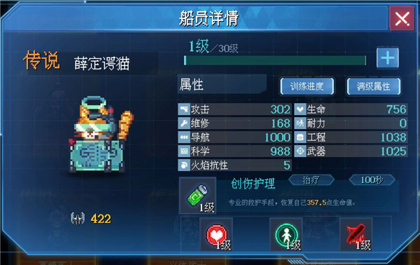【满级属性】攻击:302 生命:756维修:168 耐力:0导航:1000 工程:1038科学∶988 武器:1025火焰抗性:5