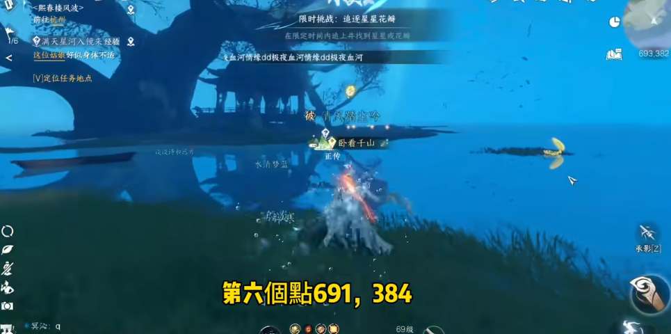 2、寻找湖底的星星,第一个坐标位置在(737,306),找到之后开启追逐星星花瓣挑战;