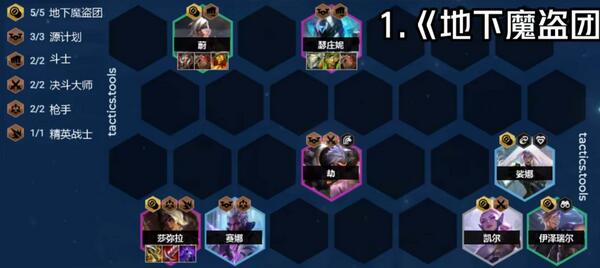 2、羁绊组成:5地下魔盗团、3源计划、2斗士、2决斗大师、2枪手、1精英战士。