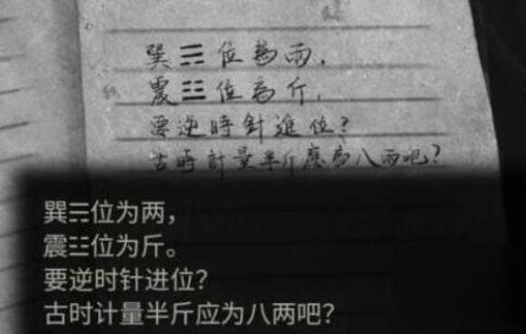 2、这个解密需要玩家看懂八卦图,按照笔记线索来记录:巽为两,震为斤,半斤等于八两,一斤等于十六两,也就是十六进制,满十五进一,还要按照逆时针方向,就是从巽来算。