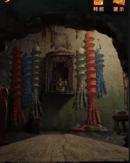 3、下方墙洞处观察屋内各种颜色的灵幡,铺上木板之后,将碎石块砸向神龛的葬老六,可以获取钥匙;