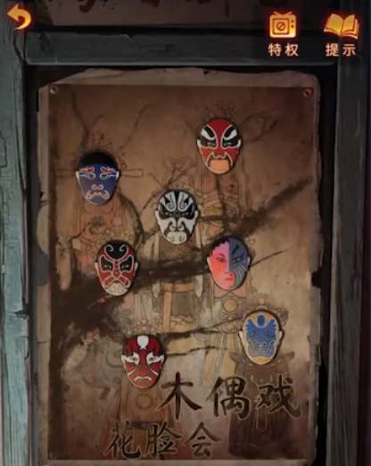 16、回到树上将脸谱摆放成下图这个样子,然后点击右边的红色戏台处用铁钩子勾出牌位;